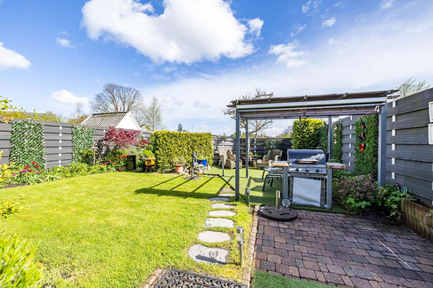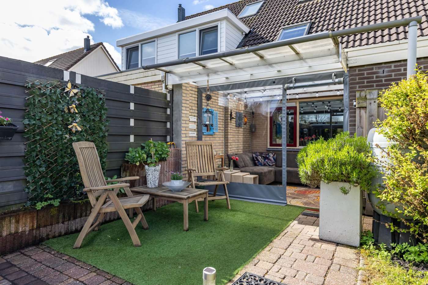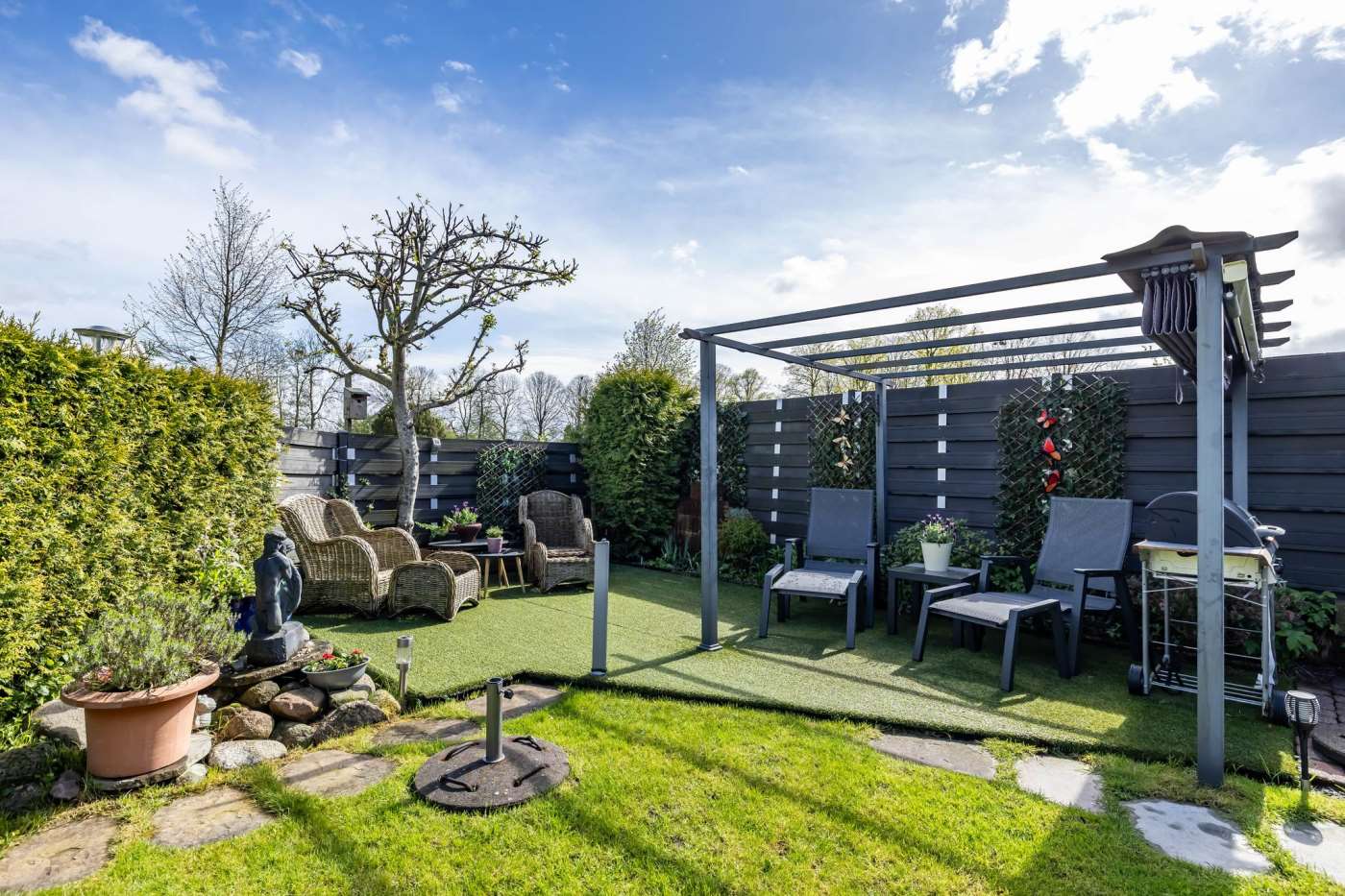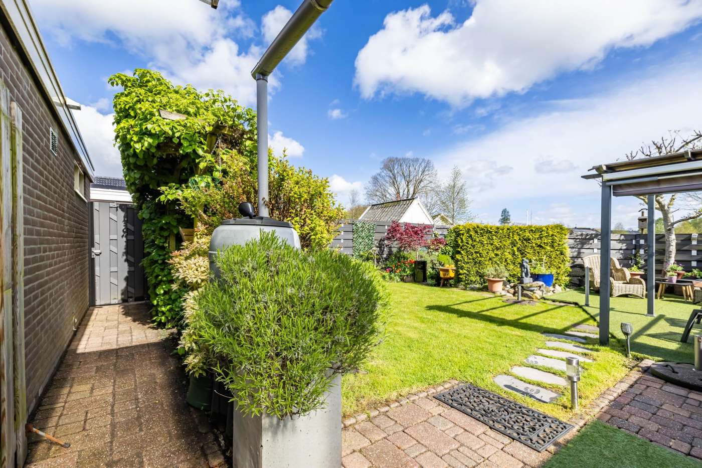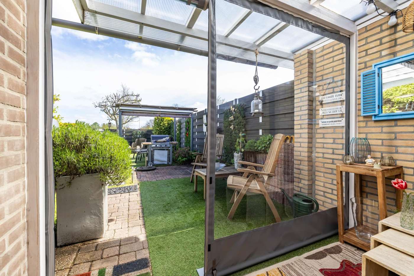 Tuin; de besloten achtertuin kan worden bereikt vanuit de bijkeuken, alweer je direct onder de aan de woning gebouwde overkapping uitkomt. Deze overkapping zou je in de nieuwe situatie bij de woning kunnen laten trekken, waardoor er een grote woonkeuken ontstaat. Ook bestaat de mogelijkheid de keuken naar de voorzijde van de woning te verplaatsen waardoor je een mooie tuingerichte woonkamer kunt creëren.