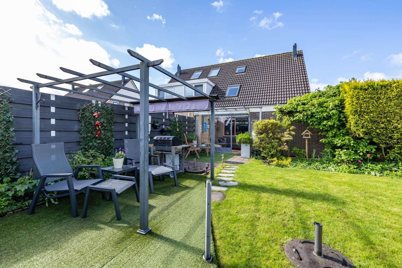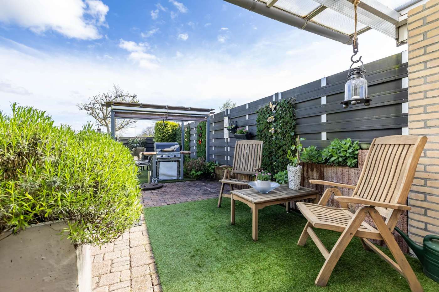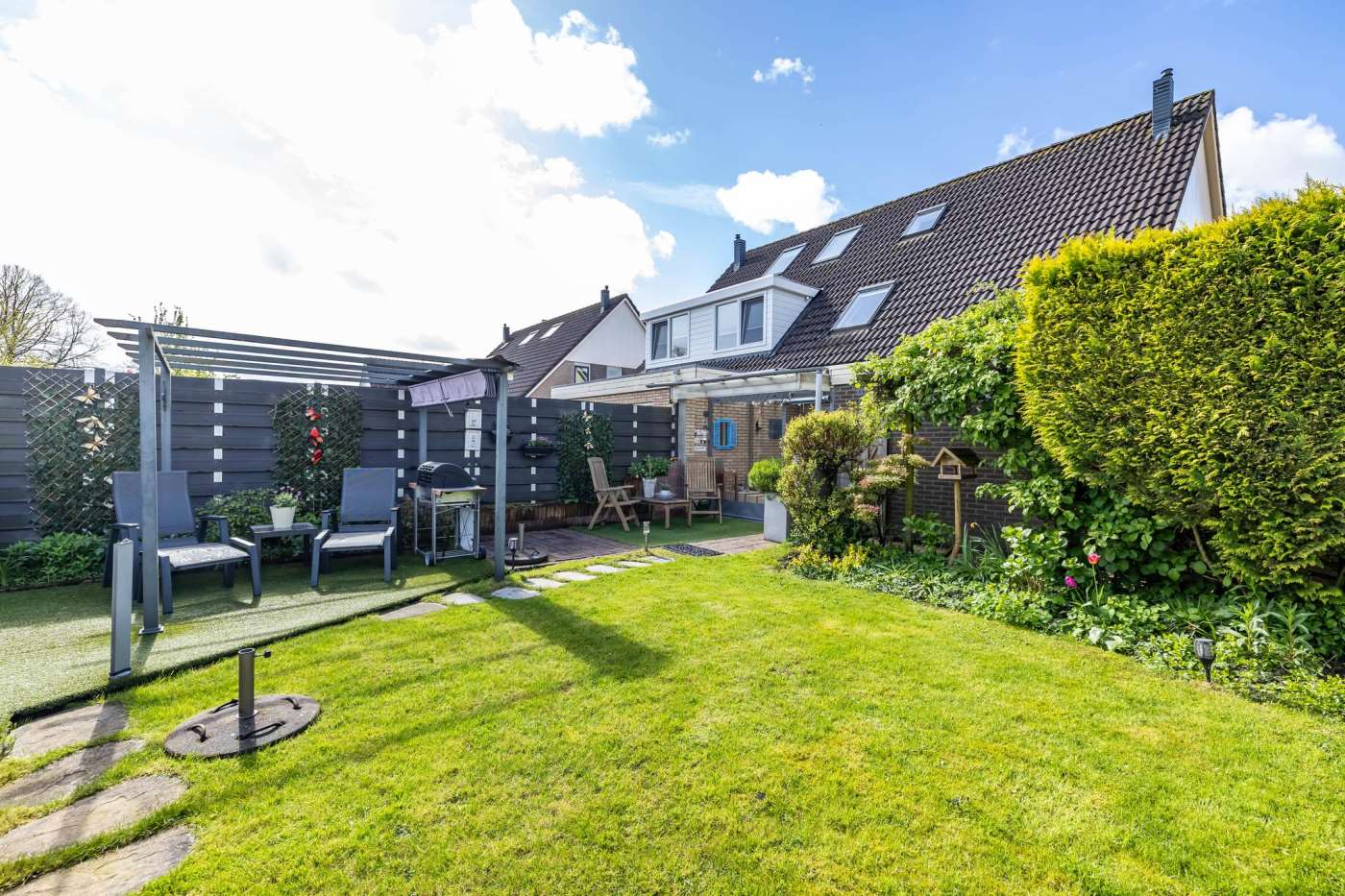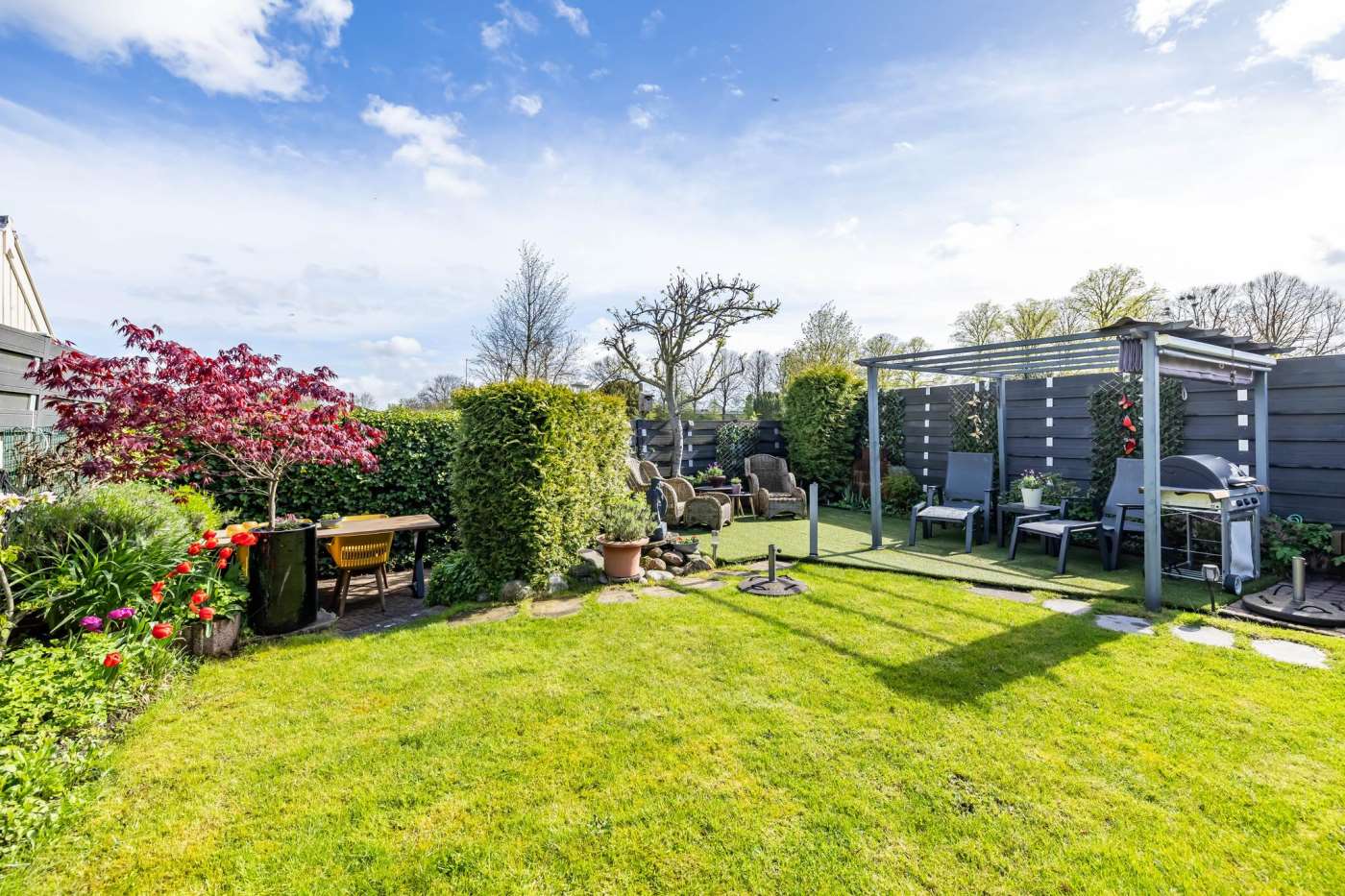 Tuin; de besloten achtertuin kan worden bereikt vanuit de bijkeuken, alweer je direct onder de aan de woning gebouwde overkapping uitkomt. Deze overkapping zou je in de nieuwe situatie bij de woning kunnen laten trekken, waardoor er een grote woonkeuken ontstaat. Ook bestaat de mogelijkheid de keuken naar de voorzijde van de woning te verplaatsen waardoor je een mooie tuingerichte woonkamer kunt creëren.