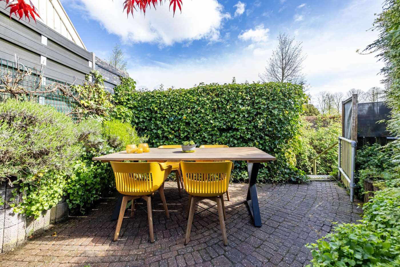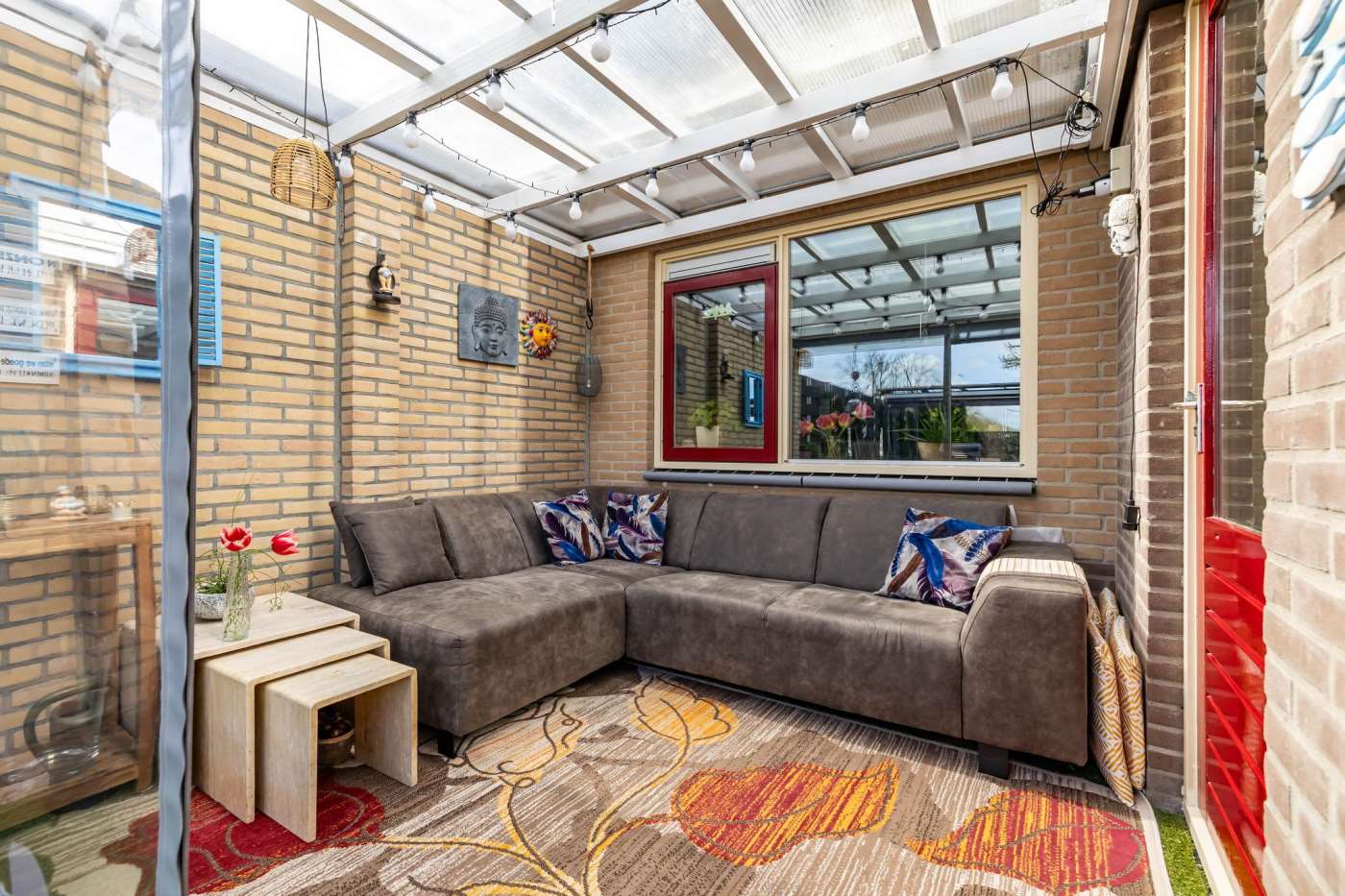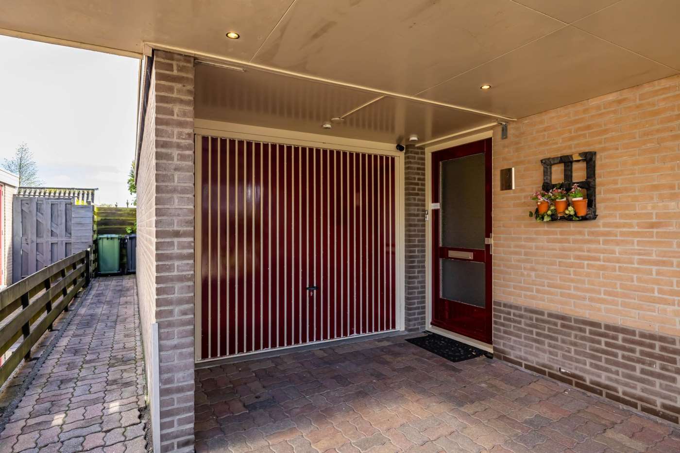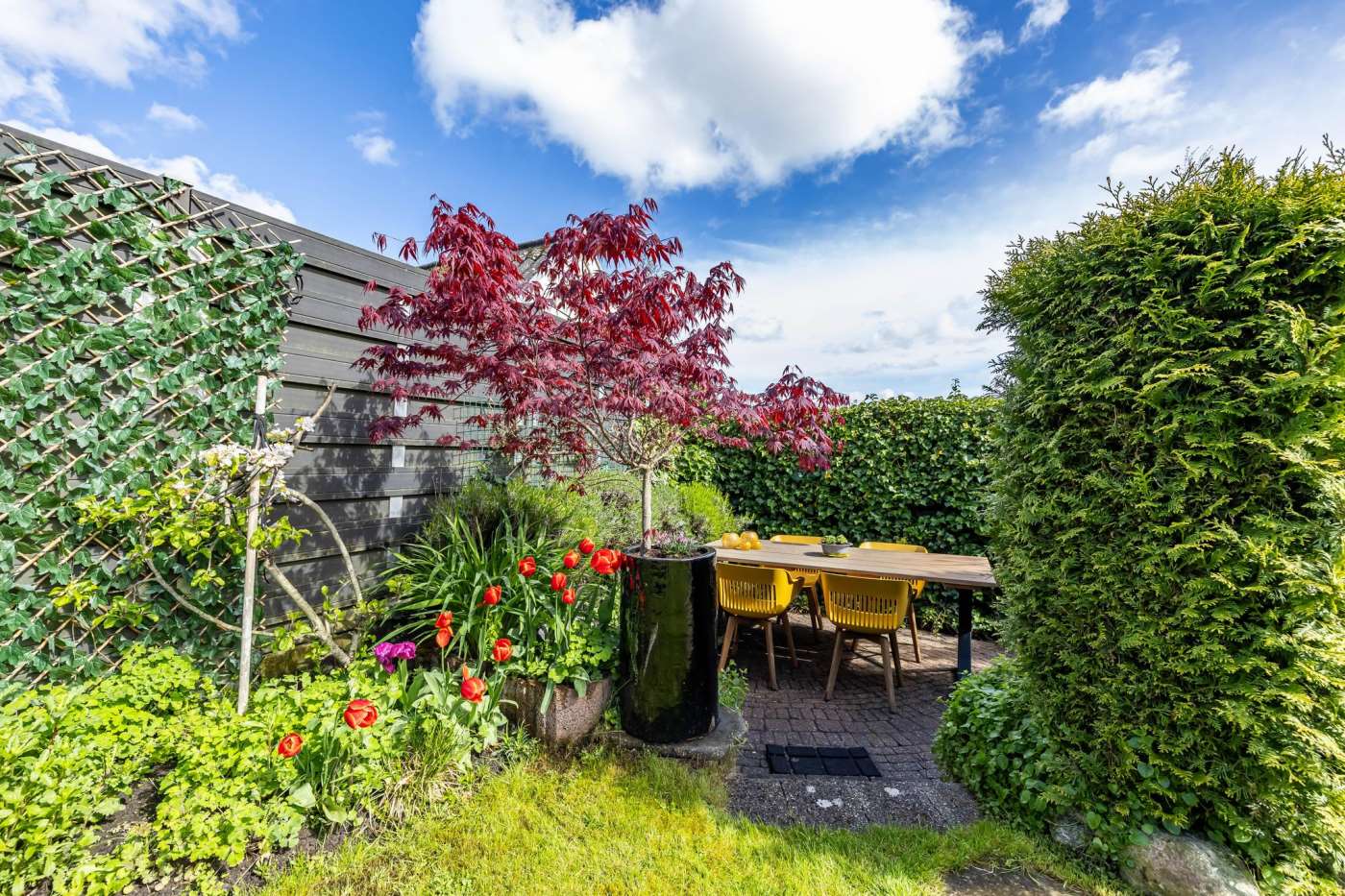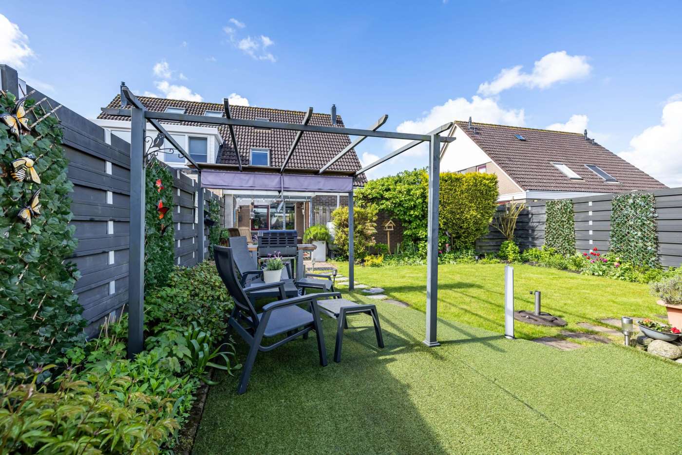 Tuin; de besloten achtertuin kan worden bereikt vanuit de bijkeuken, alweer je direct onder de aan de woning gebouwde overkapping uitkomt. Deze overkapping zou je in de nieuwe situatie bij de woning kunnen laten trekken, waardoor er een grote woonkeuken ontstaat. Ook bestaat de mogelijkheid de keuken naar de voorzijde van de woning te verplaatsen waardoor je een mooie tuingerichte woonkamer kunt creëren.