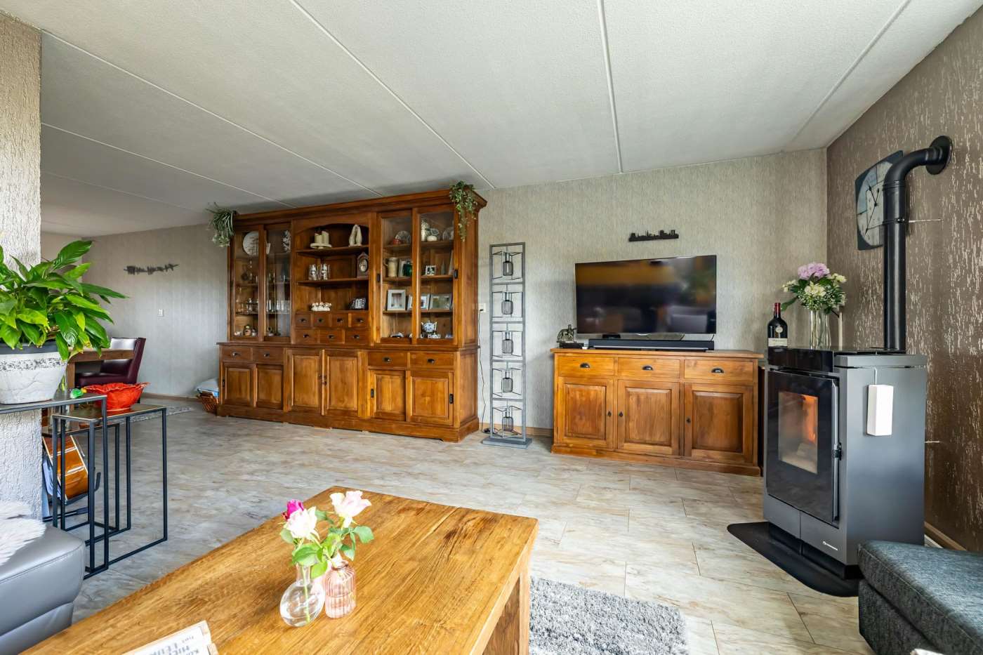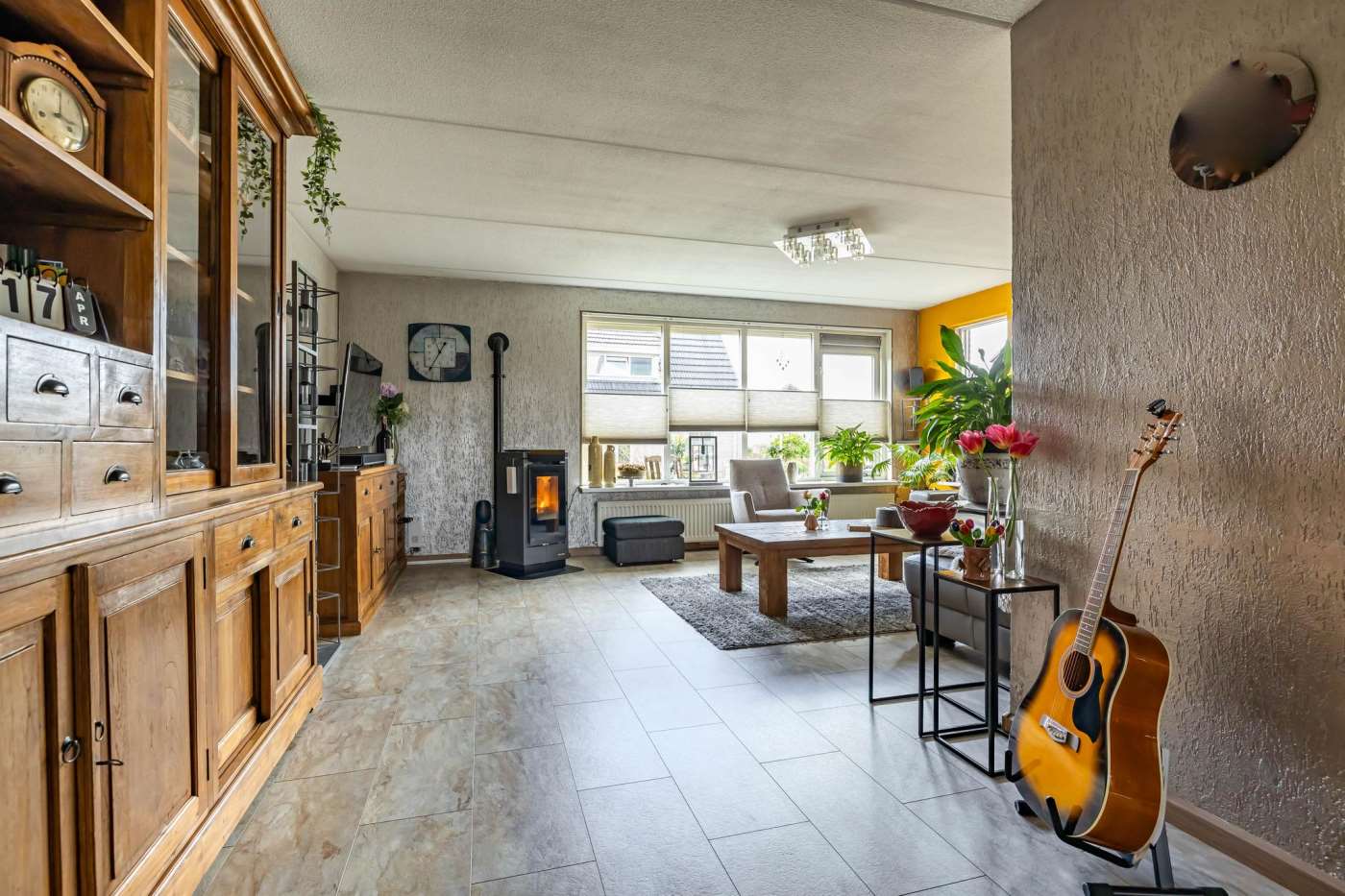 Woonkamer met open keuken (ca. 44m²). De woonkamer (laminaat) is voorzien van een pelletkachel. Keuken (plavuizen)met L-vormige opstelling (v.v. dubbele spoelbak, koelkast, 4-pitsgasstel en afzuigkap) en separate apparatenkast met inbouwoven.