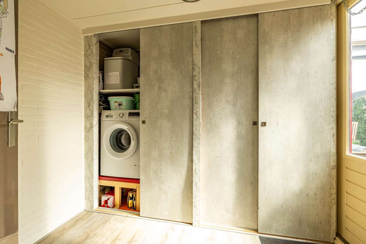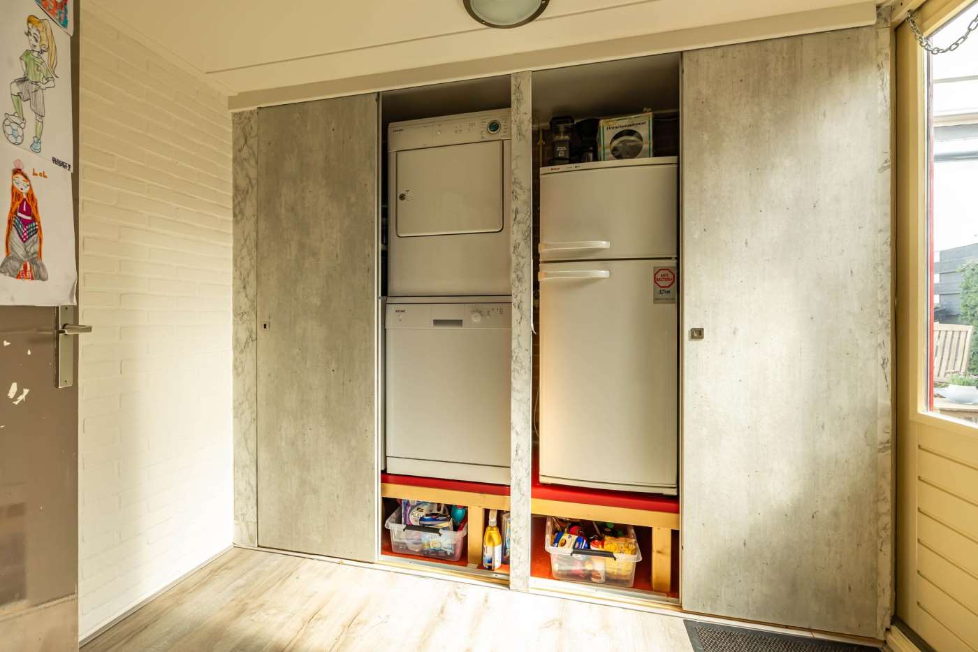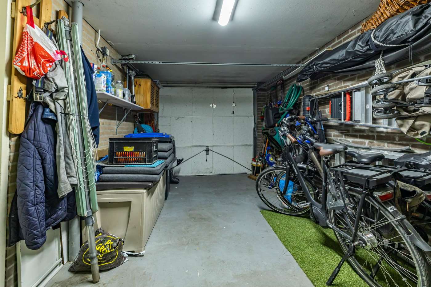Bijkeuken (ca. 6m²,pvc-laminaat) met afgewerkte kastenwand met witgoedaansluiting en toegang naar de aangebouwde garage (ca. 18m²) en overkapping.