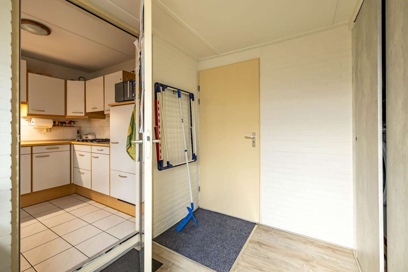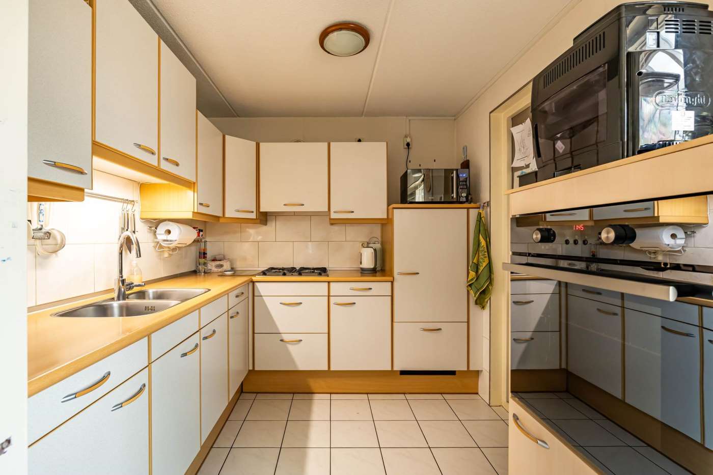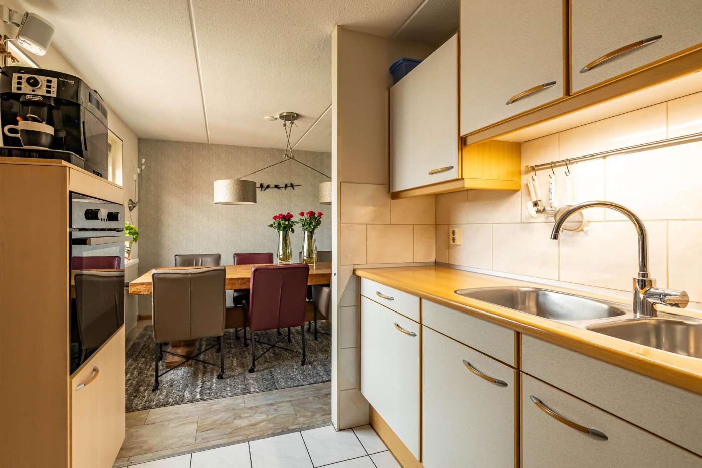 Bijkeuken (ca. 6m²,pvc-laminaat) met afgewerkte kastenwand met witgoedaansluiting en toegang naar de aangebouwde garage (ca. 18m²) en overkapping.
