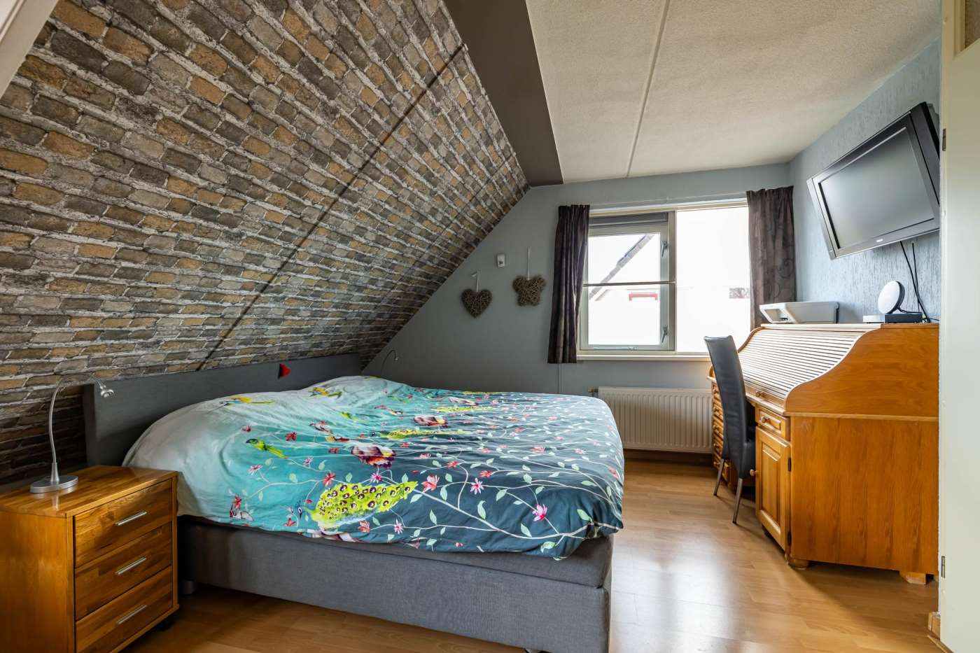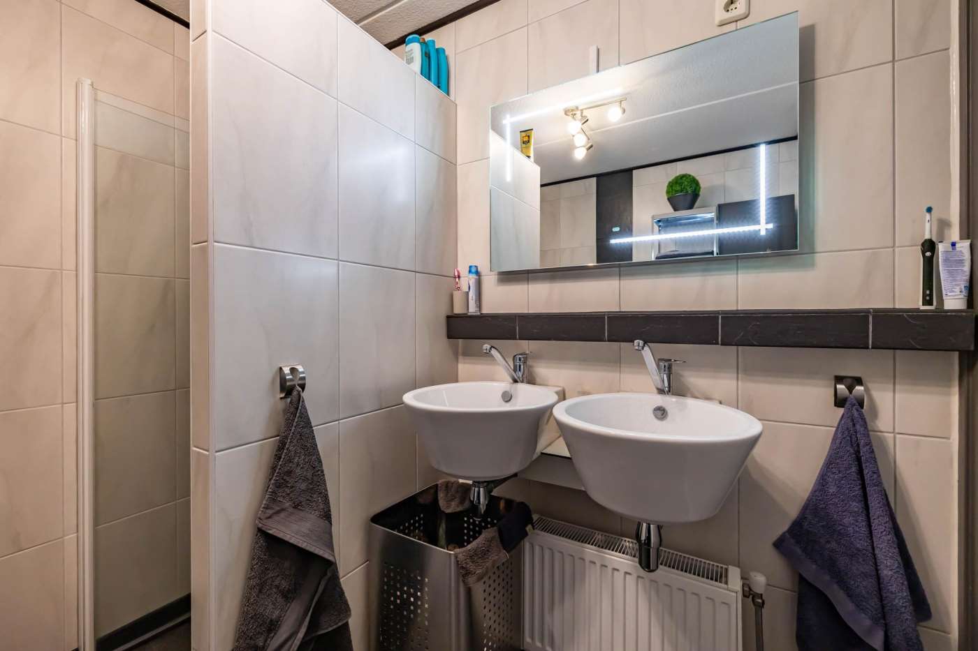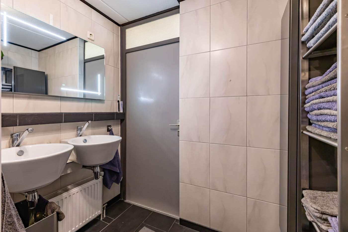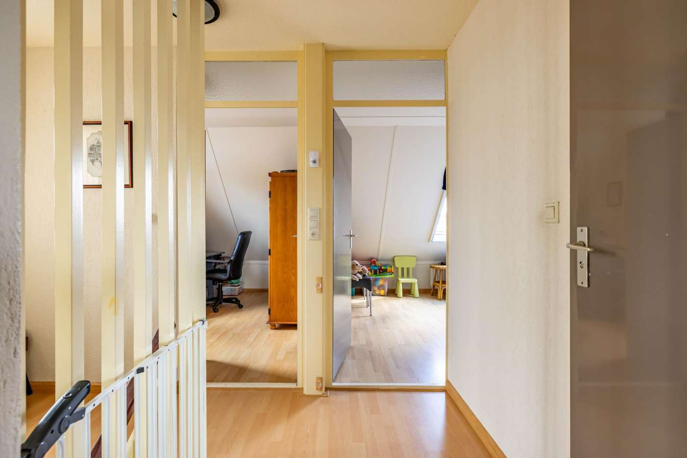 1e verdieping; overloop (laminaat) met toegang tot 3 slaapkamers (ca. 6m², 9m² en 17m²) waarvan de masterbedroom is voorzien van een dakkapel en vaste kastenwand, badkamer (v.v. dubbele wastafel, inloopdouche en 2e toilet) en trapopgang naar zolderverdieping.